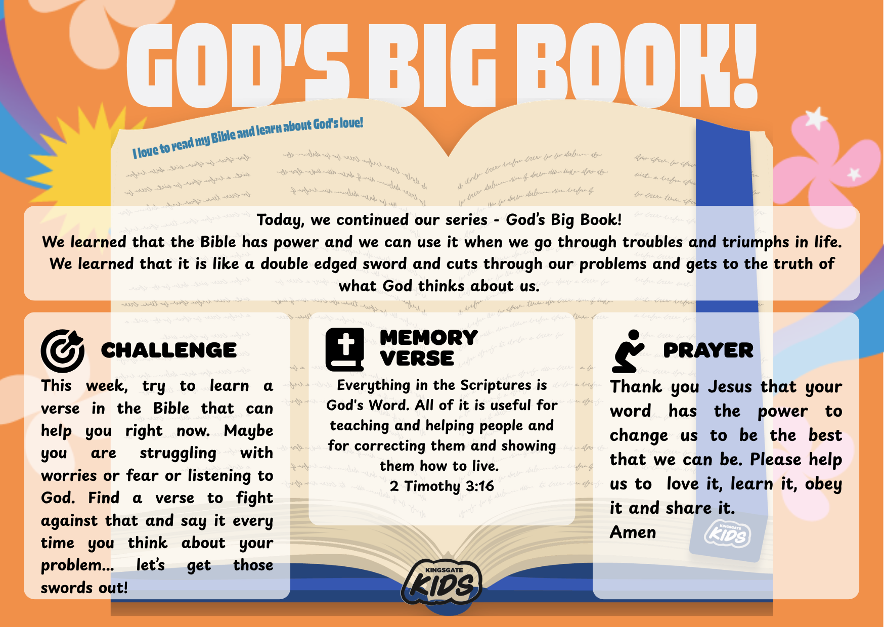 Thank you Jesus that your word has the power to change us to be the best that we can be. Please help us to Love God’s Word – It is His precious gift (get the kids to make a heart with their hands) Learn God’s Word – Read and remember His truth (Open you hands as though opening a book - think charades) Obey God’s Word – Live by what He says (march on the spot like a soldier) Share God’s Word – Tell others about Him ( Hold your hands to your mouth like a megaphone) Amen