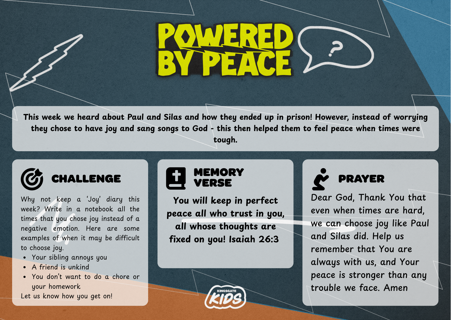 Dear God, Thank You that even when times are hard, we can choose joy like Paul and Silas did. Help us remember that You are always with us, and Your peace is stronger than any trouble we face. Amen