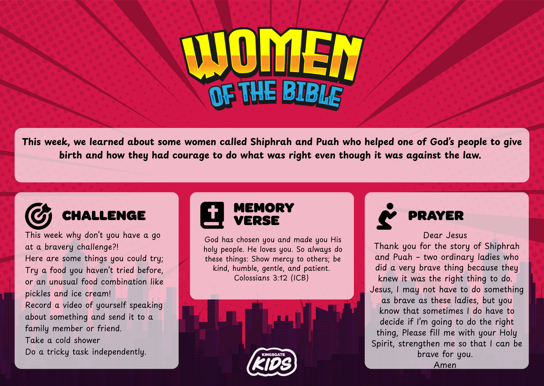 Thank you for the story of Shiphrah and Puah – two ordinary ladies who did a very brave thing because they knew it was the right thing to do. Jesus, I may not have to do something as brave as these ladies, but you know that sometimes I do have to decide if I’m going to do the right thing, Please fill me with your Holy Spirit, strengthen me so that I can be brave for you.