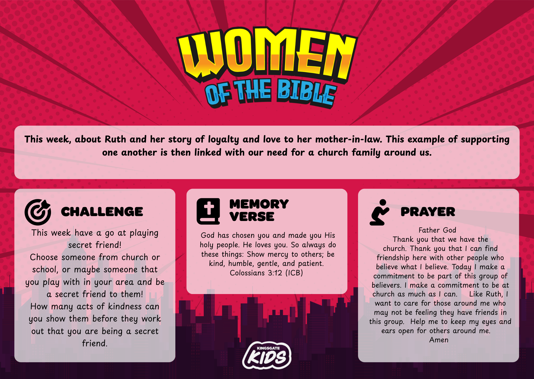 Thank you that we have the church. Thank you that I can find friendship here with other people who believe what I believe. Today I make a commitment to be part of this group of believers. I make a commitment to be at church as much as I can. Like Ruth, I want to care for those around me who may not be feeling they have friends in this group. Help me to keep my eyes and ears open for others around me.